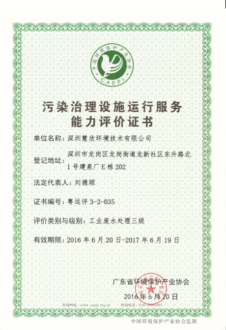 慧欣環(huán)境是廣東省環(huán)保產(chǎn)業(yè)協(xié)會理事單位,一直以來堅持高標準、嚴要求、更注重發(fā)展內(nèi)涵,秉承“成本可控穩(wěn)定達標,規(guī)避法人法律風險,解決超標排污問題,確保工廠持續(xù)經(jīng)營”的核心理念,打造一支經(jīng)驗豐富的多領(lǐng)域多學科的人才隊伍,夯實技術(shù)基礎,長期致力于客戶的“低成本穩(wěn)定達標”,通過各種途徑降低業(yè)主法律風險,為廣大用戶提供“運營管理、系統(tǒng)優(yōu)化、提標改造、程設計與承建、水站智能化、設備定制、廢氣治理、生化托管、人員派遣、中水回用、水質(zhì)檢測、資源回收”等全方位服務,是客戶身邊良好的合作伙伴。此次獲得相關(guān)證書,標志著慧欣環(huán)境進入新的發(fā)展階段,鼓舞我們朝著更高的目標努力奮進!