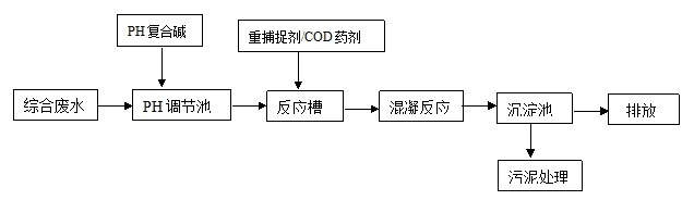 包含普通含銅廢水、酸堿廢水、處理后的油墨廢水等。污染物有銅、氨氮、COD等。與多數(shù)其他行業(yè)廢水類似,普遍采用化學法處理,采用藥劑主要有用到PH中和粉、重金屬捕捉劑、COD降解劑。重金屬捕捉劑和COD降解劑可根據(jù)殘余重金屬和COD的濃度添加,處理工藝流程如下: