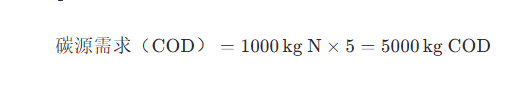 假設(shè)一個(gè)污水處理系統(tǒng)需要去除1000kg的總氮(以硝酸鹽氮計(jì)),并且采用的C/N比為5:1,則需要的碳源(以COD計(jì))為:
